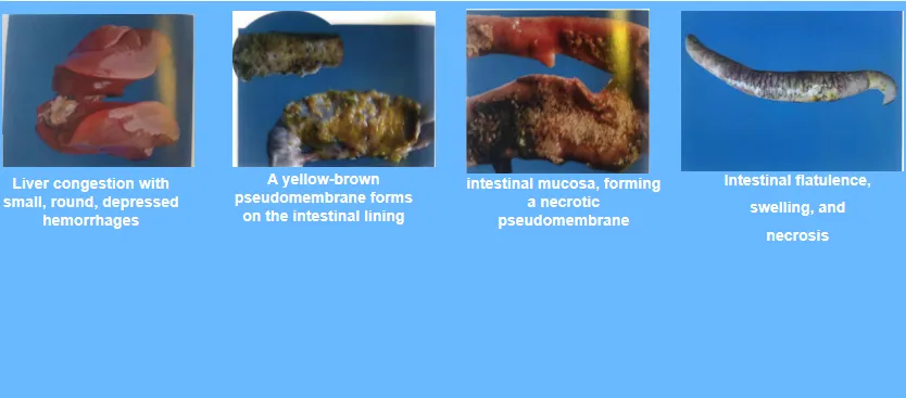 1)Chickens with acute disease are depressed, with eyes half-closed or closed, reduced feed and water intake, and excrete reddish-brown or dark-brown tarry feces, or feces mixed with sloughed intestinal mucosal tissue.